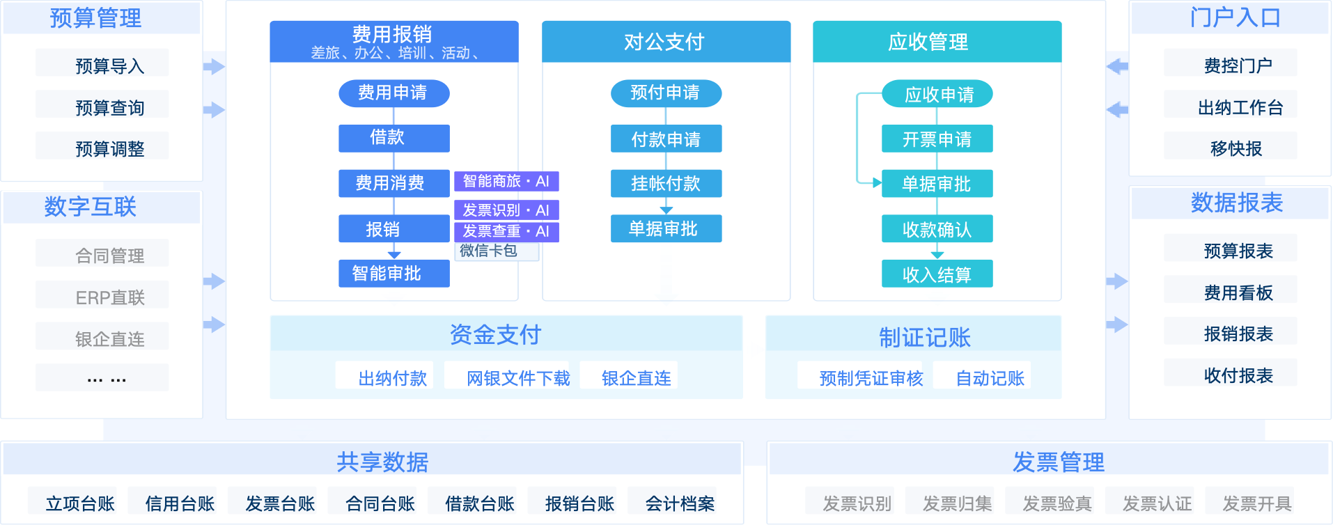 蓝凌新一代智能费控管理平台,覆盖预算管理、费用管理、发票管理、智能审单、对公支付、应收管理、数据分析等全生命周期,AI助力企业实现“业财税”一体化智能协同,赋能合规管控与运营效率双提升。